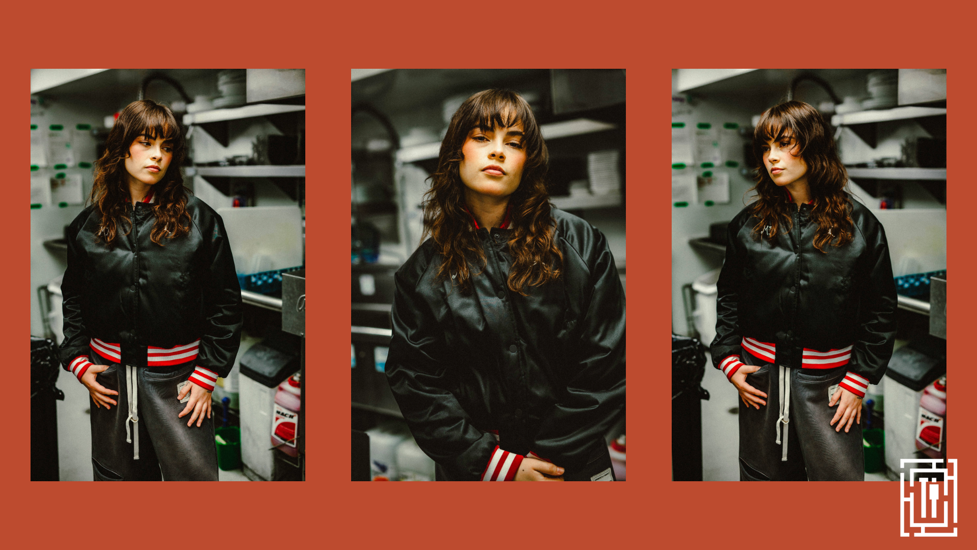 CREDITS: Destiny Rogers wears a Jordan Brand satin varsity jacket, Freddie Frances Holiday Lounge Pants, and Dr Martens shoes | Styled by Raf Talaat | photos by John Marquez, shot at Death & Co (Los Angeles)